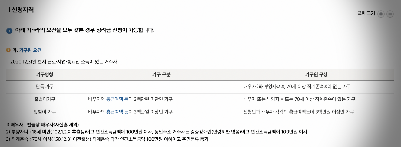 - 재산 및 소득 요건 및 지급액 -재산은 2020년 6월 1일 기준 가구원이 소유한 주택과 토지 건물, 예금 등이 재산 합계액 2억 원 미만 이면서 소득의 경우 부부합산 총소득금액이(단독 2000만 원, 홑벌이 3000만 원, 맞벌이 3600만 원) 미만, 총급여액 등에 의해 근로장려금 산정.