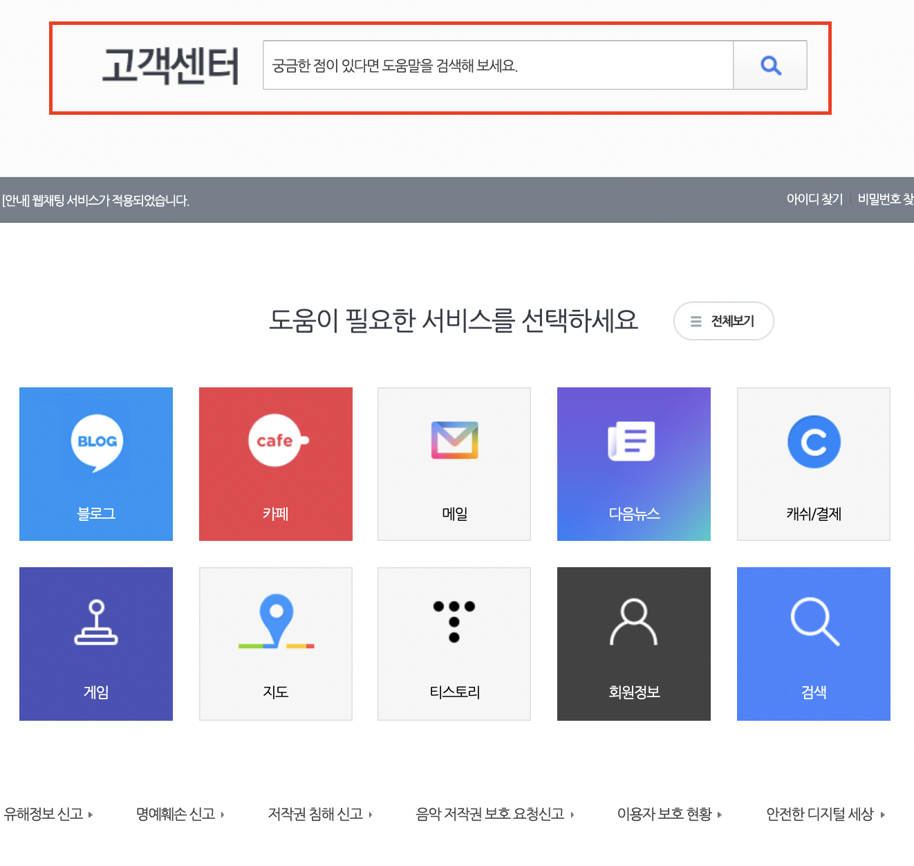 고객센터 화면으로 이동하고 보니 블로그나 카페, 메일, 뉴스, 캐쉬/결제, 지도, 게임, 티스토리, 회원정보 등에 관련한 문의를 카테고리별로 알아볼 수 있도록 나누어져 있답니다. 그 외에 도움을 청할 것이 있으면 검색을 통해서 알아 볼 수 있답니다.