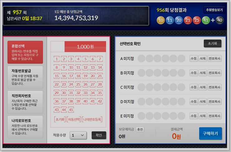 로또 구매에는 오프라인과 마찬가지로 번호를 직접 선택 가능하고, 자동선택 또한 가능합니다.