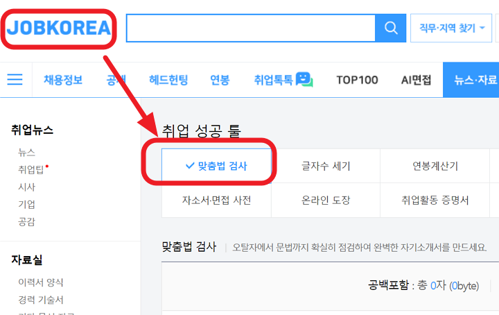잡코리아=맞춤법 검사기