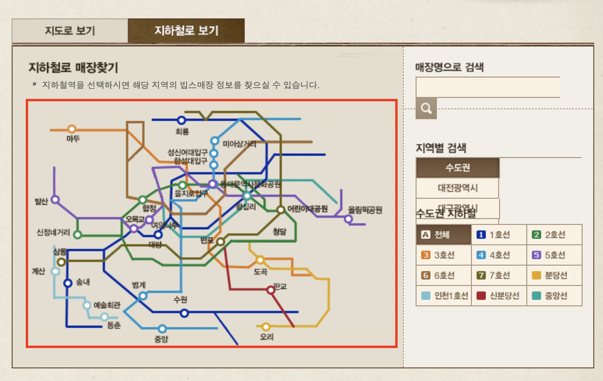 매장안내를 살펴보면 지도로 원하는 매장을 선택할 수 있으며 지하철역으로 검색을 할 수도 있습니다.