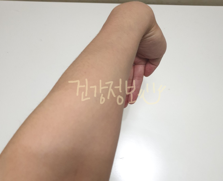 -손등을 위로 향하게 팔을 쭉뻗고 팔꿈치 아래 가장 두꺼운 근육부위를 반대손으로 강하게 누른뒤에 손목을 천천히 돌려줍니다.