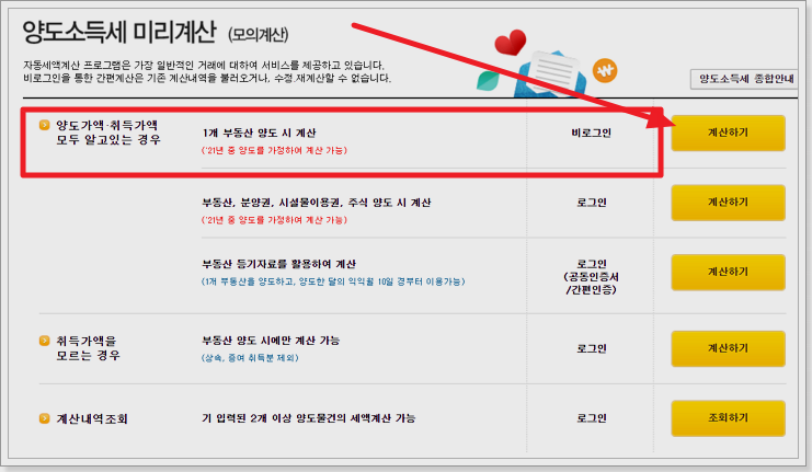 상속세 자동계산과 종합부동산세 간이세액계산등의 세액을 편하고 간편하게 조회가 가능합니다. 이번에는 양도소득세 자동계산만 진행 해 보도록 하겠습니다.