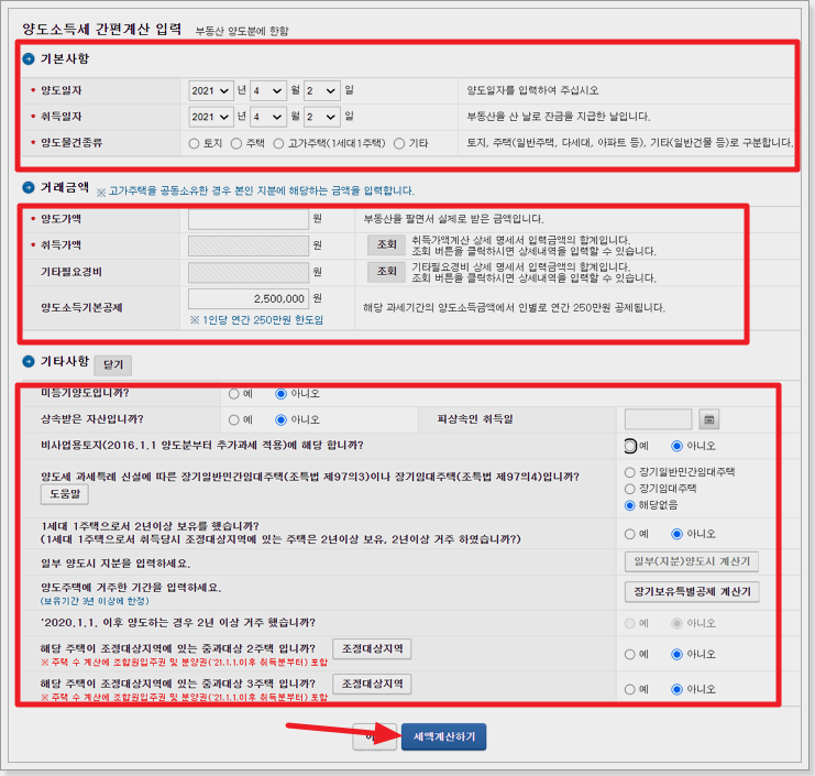 - 거래금액 / 양도가액,취득가액,기타필요경비,양도소득기본공제(최대250만원)