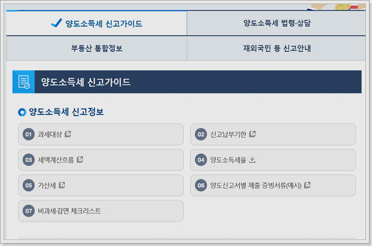 양도소득세 종합안내 포털에서는 소득세 신고가이드와 법령.상담, 부동산통합정보등의 가이드를 한눈에 확인 해 볼 수 있습니다.