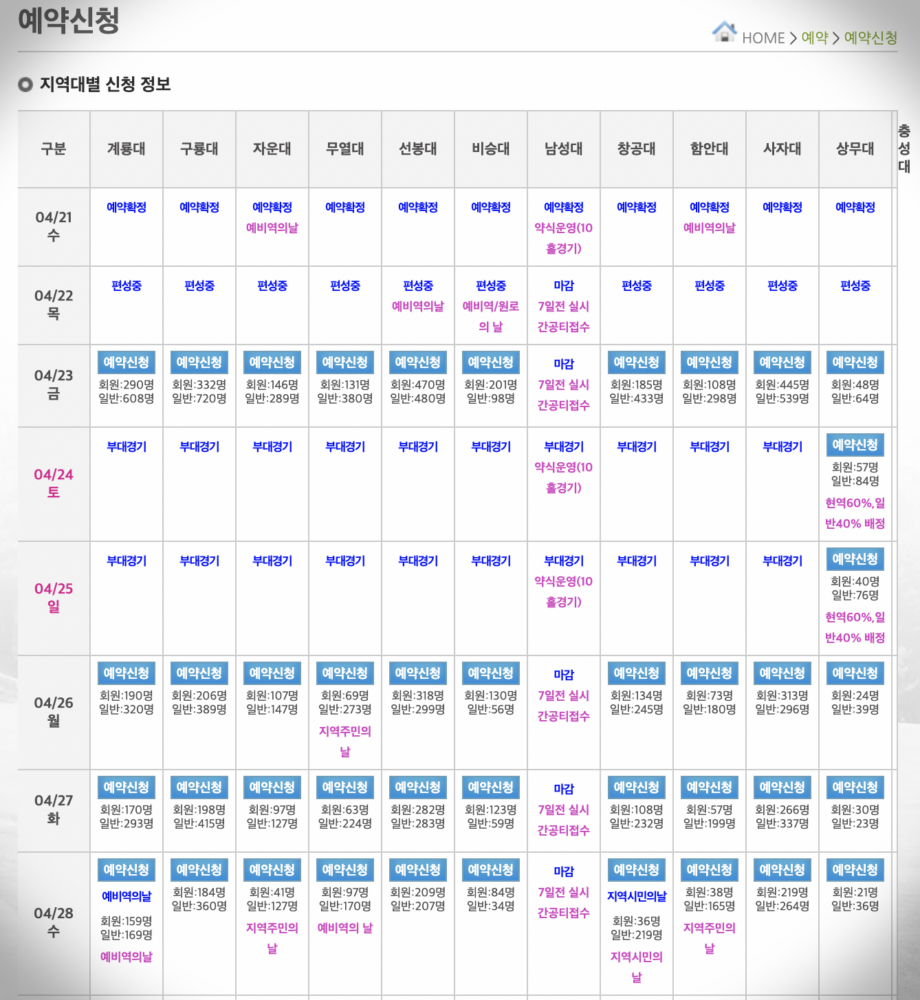 가고자 하는 지역별 날짜별로 가능한 시간과 날짜를 확인 할 수 있습니다.