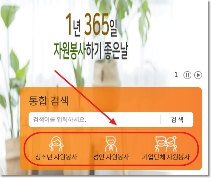 통합검색을 이용해서 찾고있는 봉사 정보가 있는지 확인할 수 있고, 청소년 자원봉사, 성인자원봉사, 기업단체 자원봉사로 분류를 나누어서 검색을 할 수도 있습니다.