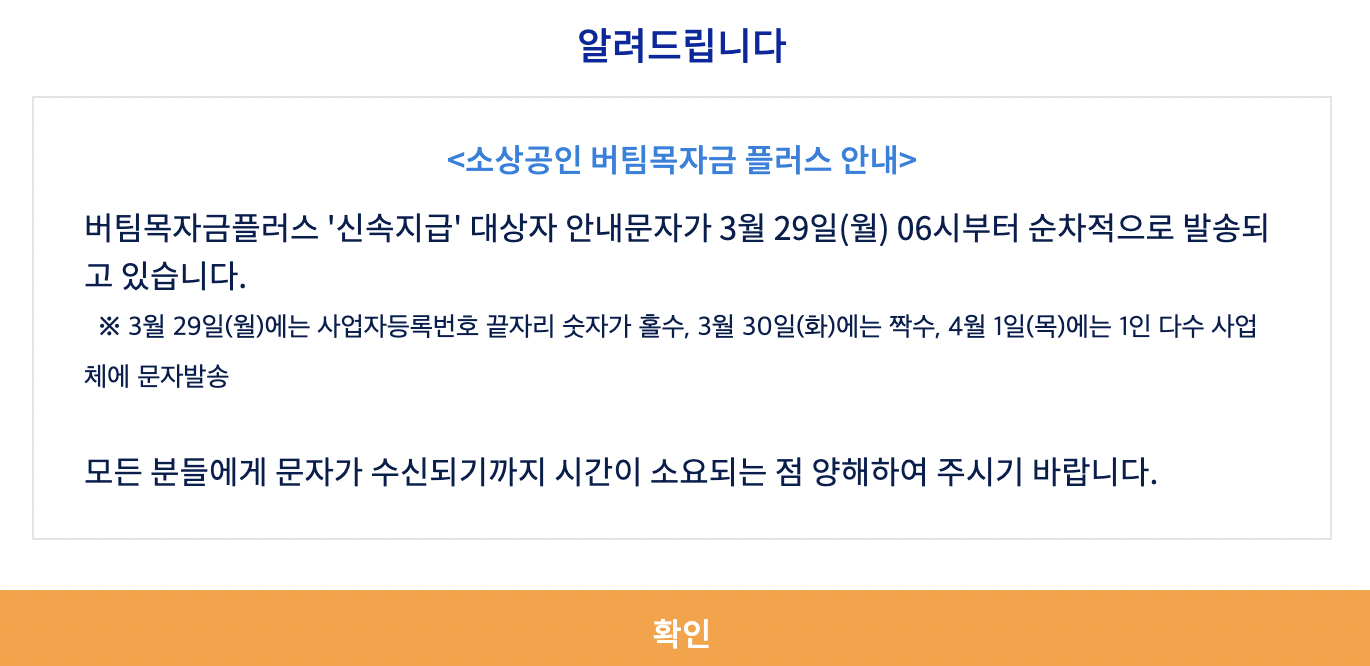 버팀목 플러스 자금의 경우 3월29일부터 안내문자 발송이 되었고, '소상공인 버팀목자금 플러스' 홈페이지에 접속하여 신청을 하시면 됩니다.